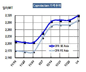 CPL(Caprolactam) 가격이 1월3일 CFR FE Asia 톤당 2300달러로 20달러 상승했다. 타이완은 1월 초 거래가격이 CFR FE Asia 톤당 2600달러로 시작했으나 최종 구매자들은 2300달러에도 구매하고 있는 것으로 알려져 손익분기점보다 낮은 거래가 진행되고 있는 것으로 드러났다. 표, 그래프: < Caprolactam 가격추이 > <화학저널 2013/01/10> |