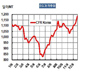 MEG 생산기업들이 가격을 올리기 위해 공급을 줄이면서 12월 지속적인 상승세를 나타내며 1170달러로 마감했으나 높은 재고수준으로 1100달러대의 강세를 유지하기는 어려울 것으로 예측된다. <최신원 기자>