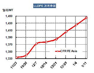 LLDPE 가격은 1월11일 CFR FE Asia 톤당 1445달러로 20달러 급등했다.