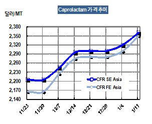 CPL(Caprolactam) 가격이 1월10일 CFR FE Asia 톤당 2350달러로 50달러 급등했다. 시장 관계자들은 약 2400달러대 후반에 거래하고자 하고 있으나 판매상들이 원료코스트 강세에 힘입어 CPL이 상승세를 지속할 것으로 기대해 거래량을 조절하고 있는 것으로 나타났다. <화학저널 2013/01/17> |