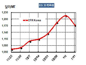 MEG 가격은 1월13일 CFR China 톤당 1172달러로 43달러 급락했다. 중국의 MEG 내수가격도 톤당 8875위안으로 250위안 떨어져 수입가격 기준 1145달러를 형성했다. 표, 그래프: < EG 가격추이 > <화학저널 2013/01/17> |