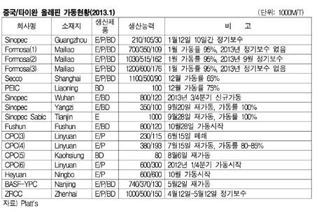 중국 올레핀(Olefin) 시장은 Sinopec의 정기보수로 상승세가 주춤하며 공급과잉이 완화될 것으로 예상된다. 반면, Formosa는 Mailiao 소재 No.1 에틸렌 70만톤 및 프로필렌 35만톤 크래커와 부타디엔 10만9000톤 플랜트의 가동률을 95%로 높게 가동하고 있으며, 2013년 정기보수 계획은 없는 것으로 알려졌다. 표, 그래프: < 중국/타이완 올레핀 가동현황(2013.1) > <화학저널 2013/01/18> |
