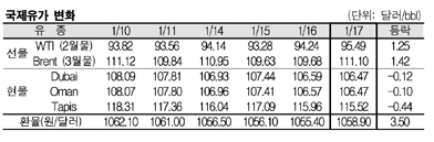 1월17일 국제유가는 미국의 경기지표 호조, 알제리 인질 사태 등으로 상승했다. 1월17일 국제유가는 미국의 경기지표 호전 소식이 전해지면서 상승했다. 표, 그래프: < 국제유가 변화 > <화학저널 2013/01/18> |
