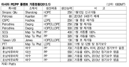 아시아 PP(Polypropylene) 시장은 높은 가동률로 공급과잉이 우려되고 있다. PE(Polyethylene)은 Sinopec Qilu Petrochemical이 Shandong 소재 HDPE(High Density PE) 25만톤 플랜트를 1월10일 신규 가동함으로써 공급과잉이 심화될 것으로 예상되고 있다. 표, 그래프: < 아시아 PE/PP 플랜트 가동현황(2013.1) > <화학저널 2013/01/21> |