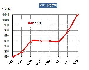 PVC 가격은 1월16일 CFR FE Asia 톤당 1010달러로 30달러 폭등했다. 타이완의 Formosa Plastics이 구정연휴에 따라 조업기간을 단축하고 2월 공급물량을 3만5000-4만톤으로 줄일 것이라고 발표했기 때문이다. 표, 그래프: < PVC 가격추이 > <화학저널 2013/01/21> |