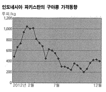 구아검(Guar Gum) 가격이 인디아, 파키스탄에서 생산되는 원료 구아콩 가격에 따라 극심하게 요동치고 있다. 표, 그래프: < 인도네시아‧파키스탄의 구아콩 가격동향 > <화학저널 2013/01/22> |
