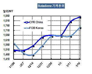부타디엔 가격은 1월18일 FOB Korea 톤당 1800달러로 60달러 급등했다. 중국 합성고무 생산기업에게 공급하는 1월 말에서 2월 초 카고는 CFR China 톤당 1800달러에 불과했으나 2월 말 공급물량이 1820-1830달러로 상승했고 결국 1850달러에 거래가 마무리됐다. 표, 그래프: < Butadiene 가격추이 > <화학저널 2013/01/22> |