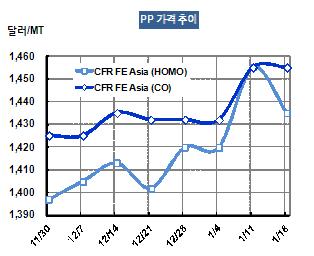 PP 가격은 1월16일 CFR FE Asia 톤당 1435달러로 20달러 급락했다. PP 공급기업들은 동북아시아 가격이 하락세로 전환됨에 따라 동남아시아로 발길을 돌리고 CFR China 톤당 1470-1480달러를 요구한 것으로 알려졌다. 표, 그래프: < PP 가격추이 > <화학저널 2013/01/22> |