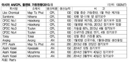아시아 CPL(Caprolactom) 시장은 1-2월 재가동이 이어지고 있어 공급과잉이 심화되고 있다. 아시아 AN(Acrylonitrile) 시장은 정기보수 발표가 잇따르고 있다. 표, 그래프: < 아시아 AN/CPL 플랜트 가동현황(2013.1) > <화학저널 2013/01/24> |