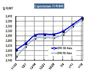 CPL 가격은 1월18일 CFR FE Asia 톤당 2390달러로 40달러 상승했다. 특히, 일본과 타이완의 CPL 생산기업들은 12월에 비해 최소 100달러 이상 올려 2430-2470달러를 요구한 것으로 알려졌다. 표, 그래프: < Caprolactam 가격추이 > <화학저널 2013/01/24> |
