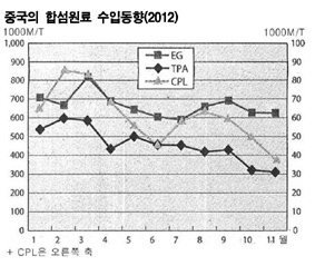 중국의 합섬원료 수입이 급격하게 감소하고 있다. 표, 그래프: < 중국의 합섬원료 수입동향(2012) > <화학저널 2013/01/28> |