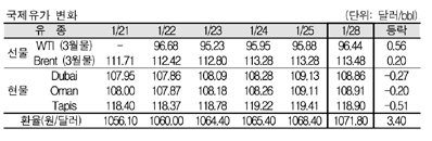 1월28일 국제유가는 미국의 경기지표 호조, 중동 정정불안, 미국의 석유제품 소비 증가 등으로 상승했다.
