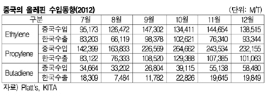 표, 그래프: < 중국의 올레핀 수입동향(2012) > <화학저널 2013/01/29> |