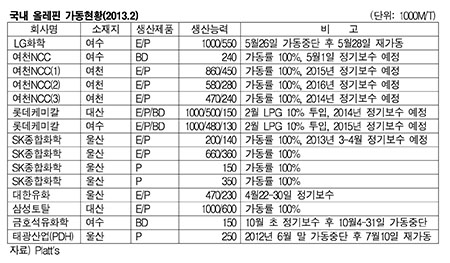 표, 그래프: < 국내 올레핀 가동현황(2013.2) > <화학저널 2013/02/05> |