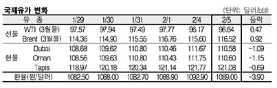 2월5일 국제유가는 세계 경기지표 호조 및 미국 달러화 약세 등의 영향으로 상승했다. 2월5일 국제유가는 주요 국가의 경기지표가 예상보다 호조를 보이면서 상승했다. 표, 그래프: <국제유가 변화 > <화학저널 2013/02/06> |