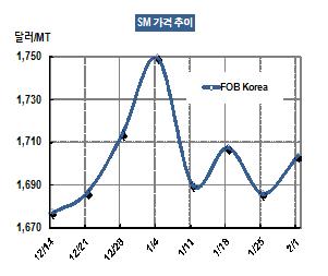 SM 가격은 2월1일 FOB Korea 톤당 1704달러로 18달러 상승했다. 동북아시아를 중심으로 2월에서 4월까지 SM 플랜트의 정기보수가 많아 수급타이트가 예상되기 때문이다. 표, 그래프: < SM 가격추이 > <화학저널 2013/02/06> |