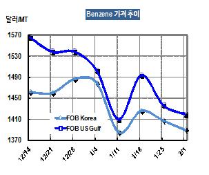벤젠 가격은 2월1일 FOB Korea 톤당 1390달러로 10달러 하락했다. 무역상들이 공격적으로 아시아 생산물량을 거래해 미국 벤젠 가격이 약화된 것으로 풀이된다. 표, 그래프: < Benzene 가격추이 > <화학저널 2013/02/06> |