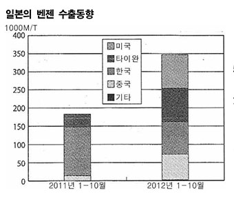 국내 벤젠(Benzene) 수입이 줄어들고 있다. 표, 그래프: < 일본의 벤젠 수출동향 > <화학저널 2013/02/06> |