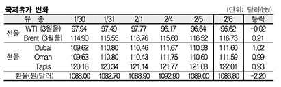 2월6일 국제유가는 유럽 초저금리 기조 유지 전망, 미국의 이란제재 시행 등의 영향으로 상승했다. 2월6일 국제유가는 유럽이 초저금리 기조를 유지할 것이라는 관측이 제기되면서 상승했다. 표, 그래프: < 국제유가 변화 > <화학저널 2013/02/07> |