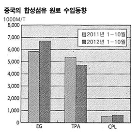 TPA(Terephthalic Acid)의 중국수출이 대폭 감소하고 있다. 표, 그래프: < 중국의 합성섬유 원료 수입동향 > <화학저널 2013/02/07> |