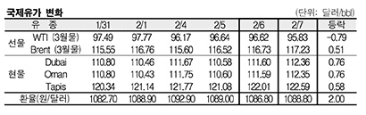 2월7일 국제유가는 이란 핵위기 고조 등의 영향으로 상승했으나 WTI는 미국 달러화 강세 등으로 하락했다. 2월7일 국제유가는 이란 핵개발 관련 긴장감이 고조되면서 상승했다. 표, 그래프: < 국제유가 변화 > <화학저널 2013/02/08> |