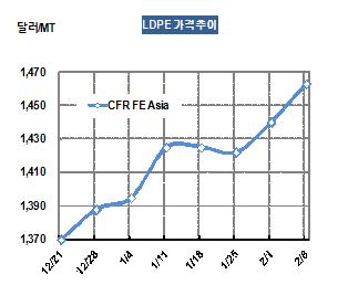 LDPE 가격은 2월7일 CFR FE Asia 톤당 1463달러로 23달러 급등했다.