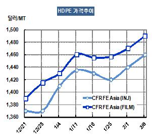 HDPE 가격은 2월7일 CFR FE Asia 톤당 1460달러로 20달러 급등했다. 표, 그래프: < HDPE 가격추이 > <화학저널 2013/02/13> |