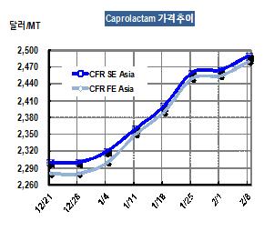 CPL 가격은 2월7일 CFR FE Asia 톤당 2480달러로 25달러 상승했다. 중국 무역상은 “춘절연휴 때문에 충분한 논의를 하지 못했다”며 “그러나 CPL 가격이 연휴 이후 더 상승할 것으로 기대한다”고 밝혔다. 표, 그래프: <Caprolactam 가격추이 > <화학저널 2013/02/15> |