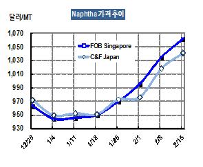 나프타 가격은 2월15일 CFR Japan 톤당 1041달러로 23달러 상승했다.