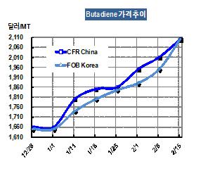 부타디엔 가격은 2월15일 FOB Korea 톤당 2100달러로 150달러 폭등했다.