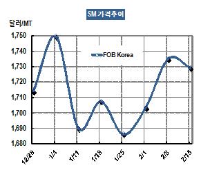 SM 가격은 2월15일 FOB Korea 톤당 1729달러로 6달러 하락했다.