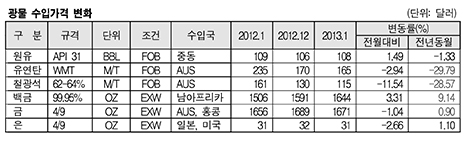 표, 그래프: < 광물 수입가격 변화 > <화학저널 2013/02/20> |
