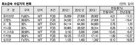 표, 그래프: < 희소금속 수입가격 변화 > <화학저널 2013/02/22> |