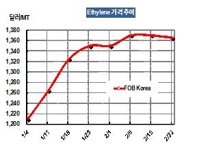 에틸렌 가격은 2월22일 FOB Korea 톤당 1365달러로 5달러 하락했다.