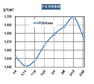P-X 가격은 2월22일 FOB Korea 톤당 1675달러로 24달러 하락했다.