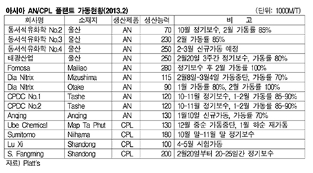 표, 그래프: < 아시아 AN/CPL 플랜트 가동현황(2013.2) > <화학저널 2013/02/28> |
