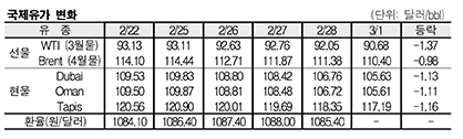 3월1일 국제유가는 세계 경기회복에 대한 우려, 미국 달러화의 강세, OPEC(석유수출국기구) 생산 증가 등의 영향으로 하락했다.