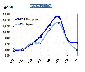 나프타 가격은 3월1일 CFR Japan 톤당 950달러로 29달러 급락했다.