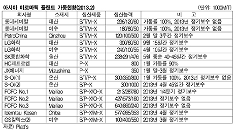 표, 그래프: < 아시아 아로마틱 플랜트 가동현황(2013.2) > <화학저널 2013/03/04> |
