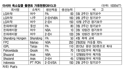 표, 그래프: < 아시아 옥소알콜 플랜트 가동현황(2013.2) > <화학저널 2013/03/05> |