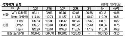 3월4일 104.81달러로 0.82달러 떨어져 … 브렌트유는 110달러 턱걸이