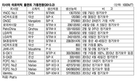표, 그래프: < 아시아 아로마틱 플랜트 가동현황(2013.2) > <화학저널 2013/03/07> |