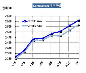 CPL(Caprolactam) 가격은 2월28일 CFR FE Asia 2540달러로 30달러 상승했다.