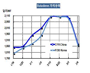 부타디엔 가격은 3월8일 FOB Korea 톤당 1865달러로 215달러 폭락했다.