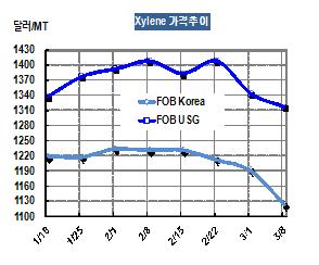 M-X 가격은 3월8일 FOB Korea 톤당 1123달러로 67달러 급락했다.