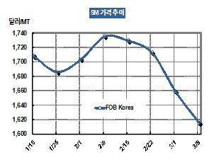 SM 가격은 3월6일 FOB Korea 톤당 1615달러로 43달러 급락했다.