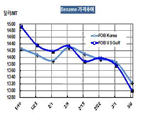 벤젠 가격은 3월8일 FOB Korea 톤당 1324달러로 61달러 급락했다. 특히, 미국의 벤젠 현물가격이 FOB US Gulf 갤런당 434센트로 톤당 1302달러를 형성해 75달러 폭락한 것이 큰 영향을 미쳤다. 표, 그래프: < Benzene 가격추이 > <화학저널 2013/03/13> |