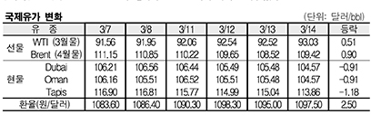 3월13일 국제유가는 미국의 경기지표 호조, 주요국가의 증시 강세, 미국 달러화의 약세 등으로 상승했다.