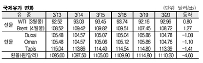 3월20일 국제유가는 키프로스의 유로존 리스크 완화 기대감, 미국 연방준비제도의 양적완화 유지 발표, 미국의 원유 재고 감소 등으로 상승했다.