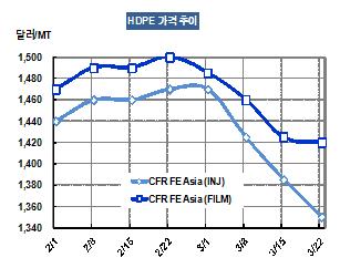 HDPE 가격은 3월20일 CFR FE Asia 톤당 1350달러로 35달러 폭락했다. 타이완의 무역상은 4월 공급물량에 대해 FOB Taiwan 톤당 1450달러를 요구했으나 CFR China 톤당 1430- 1450달러에 불과했다. 표, 그래프: < HDPE 가격추이 > <화학저널 2013/03/25> |